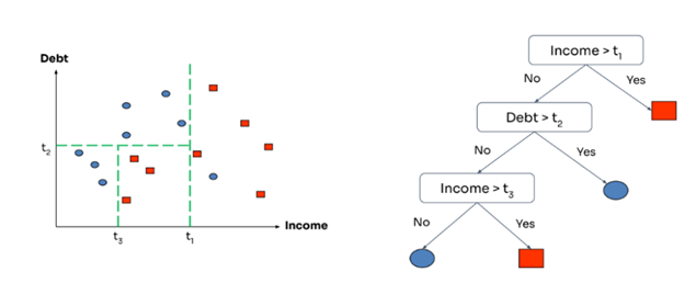Decision tree membagi dataset menjadi beberapa wilayah (berbentuk kotak). Algoritma ini memilih fitur dan ambang batas yang dapat membagi target dengan baik. Langkah ini diulangi hingga kedalaman maksimum yang diinginkan tercapai, yang akan membuat batasan untuk mengklasifikasikan data berdasarkan wilayah yang telah dibuat sebelumnya.